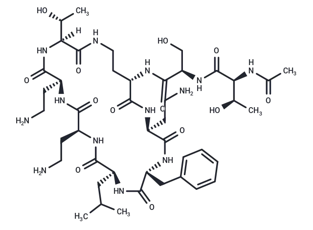 – C([C@@H]1C(=O)N[C@@H](CC(C)C)C(=O)N[C@@H](CCN)C(=O)N[C@@H](CCN)C(=O)N[C@@]([C@@H](C)O)(C(=O)NCC[C@H](NC([C@H](NC([C@@H](NC(C)=O)[C@@H](C)O)=O)CO)=O)C(=O)N[C@@H](CCN)C(=O)N1)[H])C2=CC=CC=C2