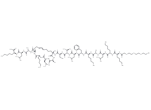 – CC(C)C[C@H](NC(=O)[C@H](C)NC(=O)[C@]1(C)CCCC=CCCC[C@](C)(NC(=O)[C@H](CO)NC(=O)[C@@H](NC(=O)[C@H](CC(C)C)NC(=O)[C@H](Cc2ccccc2)NC(=O)[C@H](CCCCN)NC(=O)[C@H](C)NC(=O)[C@H](CC(C)C)NC(=O)[C@H](CCCCN)NC(=O)[C@H](CCCCN)NC(=O)COCCOCCOCCN)C(C)C)C(=O)N[C@@H](C)C(=O)N[C@@H](CC(C)C)C(=O)N[C@@H](CCCCN)C(=O)N1)C(=O)N[C@@H](CCCCN)C(N)=O |w:18.17,@@:108|
