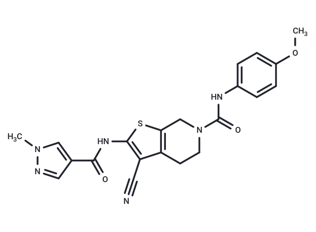 – C(#N)C=1C2=C(SC1NC(=O)C=3C=NN(C)C3)CN(C(NC4=CC=C(OC)C=C4)=O)CC2