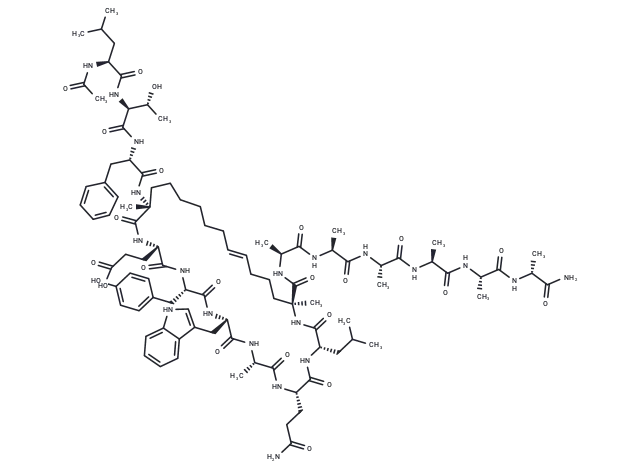 – CC(C)C[C@H](NC(C)=O)C(=O)N[C@@H]([C@@H](C)O)C(=O)N[C@@H](Cc1ccccc1)C(=O)N[C@]1(C)CCCCCCC=CCCC[C@](C)(NC(=O)[C@H](CC(C)C)NC(=O)[C@H](CCC(N)=O)NC(=O)[C@H](C)NC(=O)[C@H](Cc2c[nH]c3ccccc23)NC(=O)[C@H](Cc2ccc(O)cc2)NC(=O)[C@H](CCC(O)=O)NC1=O)C(=O)N[C@@H](C)C(=O)N[C@@H](C)C(=O)N[C@@H](C)C(=O)N[C@@H](C)C(=O)N[C@@H](C)C(=O)N[C@H](C)C(N)=O