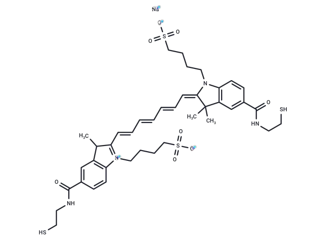 – Sulfo Cy7 bis-SH is a fluorescent dye that incorporates a sulfonated Cyanine7 (Sulfo-CY7) dye and thiol (-SH) functional groups. The highly reactive SH groups can form stable thioether bonds through reactions with various functional groups, such as maleimide.