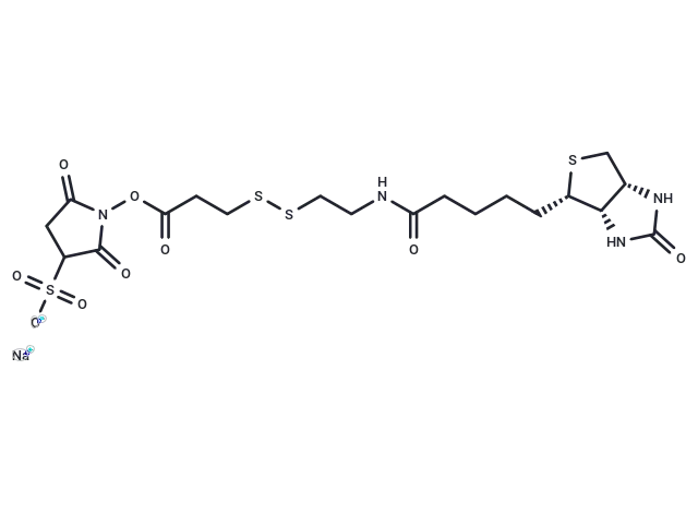 – Sulfo-NHS-SS-Biotin sodium (Sulfosuccinimidyl 3-[[2-(biotinamido)ethyl]dithio]propionate) is a cell-impermeant and long-chain cleavable amine-reactive biotinylation reagent. It can be used for the labeling and purifying of cell-surface protein.