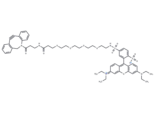 – Sulforhodamine-PEG4-DBCO is a PEG derivative comprising a DBCO group and a rhodamine dye. DBCO enables copper-free click chemistry, reacting with azide-containing compounds or biomolecules to form stable triazole linkages. This reagent is an ideal alternative for applications intolerant to copper, suitable for labeling cells, tissues, biomarkers, or nanoparticles.