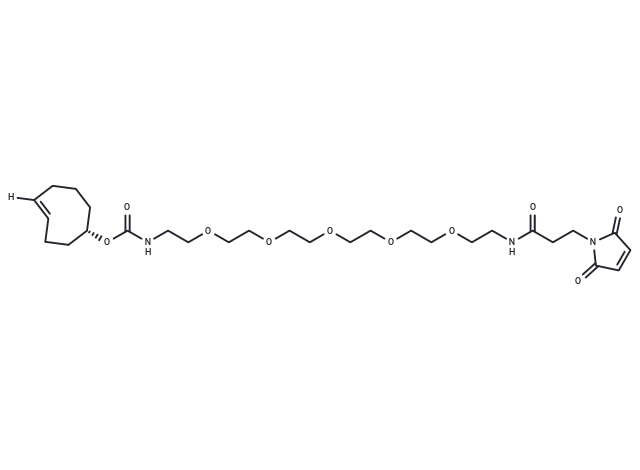 – TCO-PEG5-maleimide, a PEG-based linker for PROTACs, joins two essential ligands essential for PROTAC molecule formation and enables selective protein degradation by leveraging the ubiquitin-proteasome system within cells.