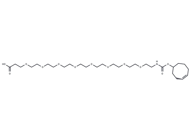 – TCO-PEG8-acid, a PEG-based linker for PROTACs, joins two essential ligands, facilitating selective protein degradation via the ubiquitin-proteasome system within cells.