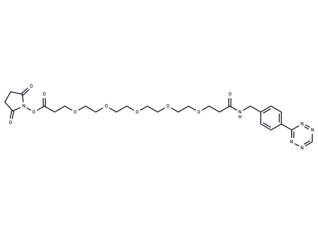 – Tetrazine-Ph-PEG5-NHS ester is a PEG-based PROTAC linker that can be used for the synthesis of PROTAC molecules with a tetrazine moiety, which allows click chemistry with molecules containing a TCO moiety.