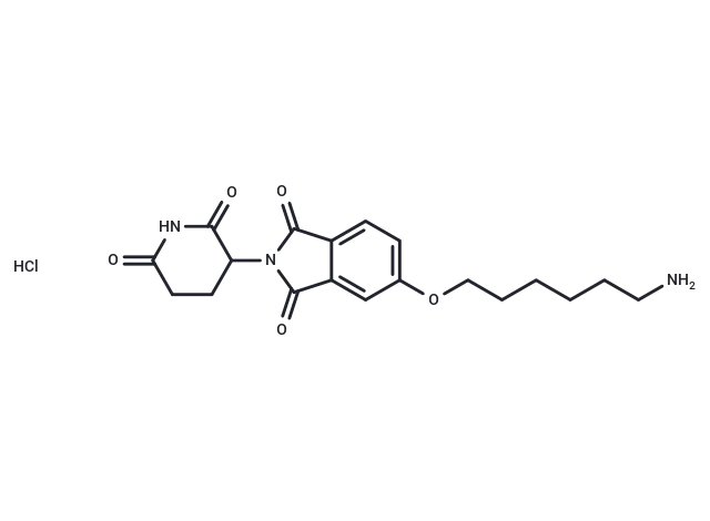 – Thalidomide-5-O-C6-NH2 hydrochloride, a Thalidomide-based cereblon ligand, facilitates the recruitment of CRBN protein and can be conjugated via a linker to another ligand to form proteolysis-targeting chimeras (PROTACs) [1].