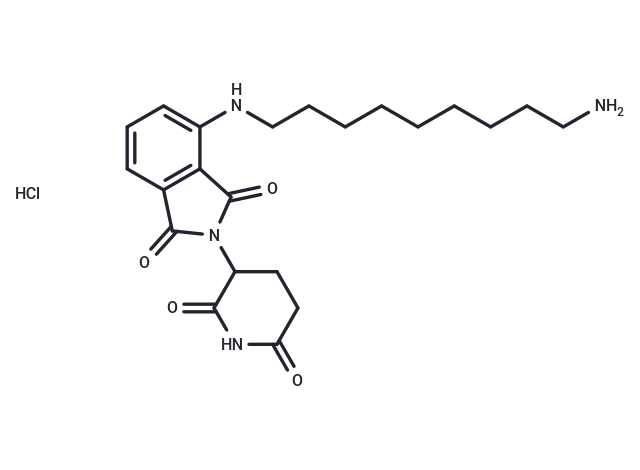 – Thalidomide-NH-C9-NH2 hydrochloride, a Thalidomide-based cereblon ligand, facilitates the recruitment of CRBN protein. This compound can be conjugated to a protein-targeting ligand via a linker, enabling the formation of proteolysis-targeting chimeras (PROTACs) [1].