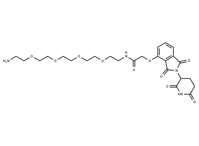 – Thalidomide-O-amido-PEG4-C2-NH2 is a synthesized conjugate combining a Thalidomide-based cereblon ligand with a (PROTAC) technology linker, acting as an E3 ligase ligand-linker conjugate to enable targeted protein degradation.