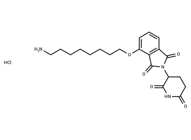 – Thalidomide-O-C8-NH2 hydrochloride is a chemical compound consisting of a synthesized E3 ligase ligand-linker conjugate. This compound incorporates a cereblon ligand derived from Thalidomide, as well as a linker employed in PROTAC technology.
