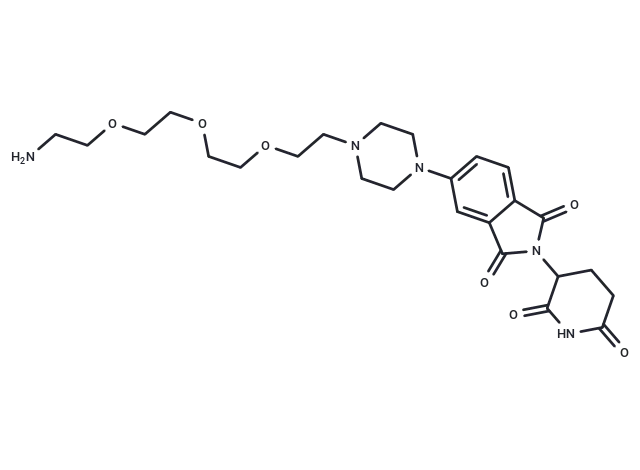 – Thalidomide-Piperazine-PEG3-NH2 is a synthesized E3 ligase ligand-linker conjugate that combines a Thalidomide-based cereblon ligand with a linker commonly used in [PROTAC] technology, functioning as an E3 ligase recruiter.
