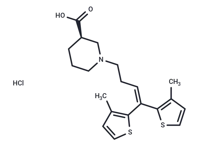 – Tiagabine hydrochloride (NO050328 hydrochloride) is the hydrochloride salt form of tiagabine, a nipecotic acid derivative with anticonvulsant property. A selective gamma-aminobutyric acid (GABA) reuptake inhibitor.