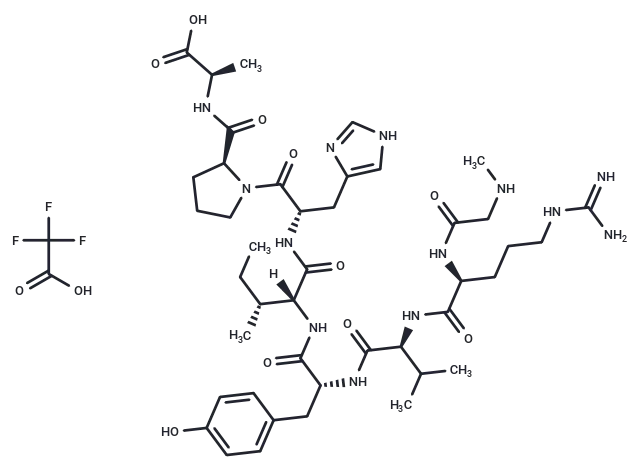 – TRV-120027 TFA is an angiotensin II–mediated vasoconstriction inhibitor and increases cardiomyocyte contractility. TRV-120027 TFA is a β-arrestin-1-biased AT1R agonist engaging ß-arrestins while blocking G-protein signaling[1]. TRV-120027 TFA induces acute catecholamine secretion through cation channel subfamily C3 (TRPC3) coupling and promotes the formation of a macromolecular complex composed of AT1R–β-arrestin-1–TRPC3–PLCγ at the plasma membrane.