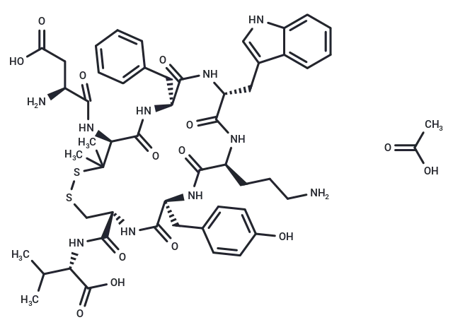 – CC([C@@H](C(O)=O)NC([C@@H]1CSSC(C)([C@H](C(N[C@H](C(N[C@@H](C(N[C@H](C(N[C@H](C(N1)=O)Cc2ccc(O)cc2)=O)CCCN)=O)Cc(c[nH]3)c4c3cccc4)=O)Cc5ccccc5)=O)NC([C@H](CC(O)=O)N)=O)C)=O)C.CC(O)=O