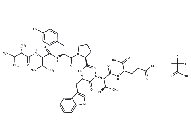 – CC(C)[C@H](N)C(=O)N[C@H](C(=O)N[C@@H](Cc1ccc(O)cc1)C(=O)N1CCC[C@H]1C(=O)N[C@@H](Cc1c[nH]c2ccccc12)C(=O)N[C@H](C(=O)N[C@@H](CCC(N)=O)C(=O)O)[C@@H](C)O)C(C)C.O=C(O)C(F)(F)F