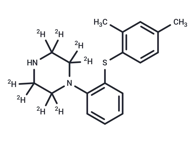 – Vortioxetine D8 is a deuterium-labeled Vortioxetine, a compound that inhibits 5-HT1A, 5-HT1B, 5-HT3A, 5-HT7 receptors and SERT with [Kis: 15 nM, 33 nM, 3.7 nM, 19 nM, and 1.6 nM, respectively].