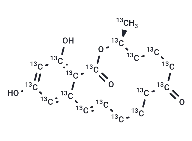 – [13CH3][13C@H]1[13CH2][13CH2][13CH2][13C](=O)[13CH2][13CH2][13CH2][13CH]=[13CH][13c]2[13cH][13c](O)[13cH][13c](O)[13c]2[13C](=O)O1 |t:10|