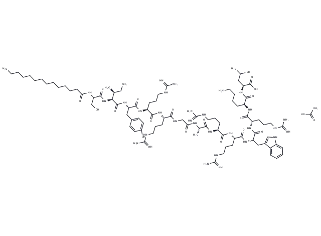 – CCCCCCCCCCCCCC(=O)N[C@@H](CO)C(=O)N[C@@H]([C@@H](C)CC)C(=O)N[C@@H](CC1=CC=C(C=C1)O)C(=O)N[C@@H](CCCNC(=N)N)C(=O)N[C@@H](CCCNC(=N)N)C(=O)NCC(=O)N[C@@H](C)C(=O)N[C@@H](CCCNC(=N)N)C(=O)N[C@@H](CCCNC(=N)N)C(=O)N[C@@H](CC2=CNC3=CC=CC=C32)C(=O)N[C@@H](CCCNC(=N)N)C(=O)N[C@@H](CCCCN)C(=O)N[C@@H](CC(C)C)C(=O)O.CC(=O)O