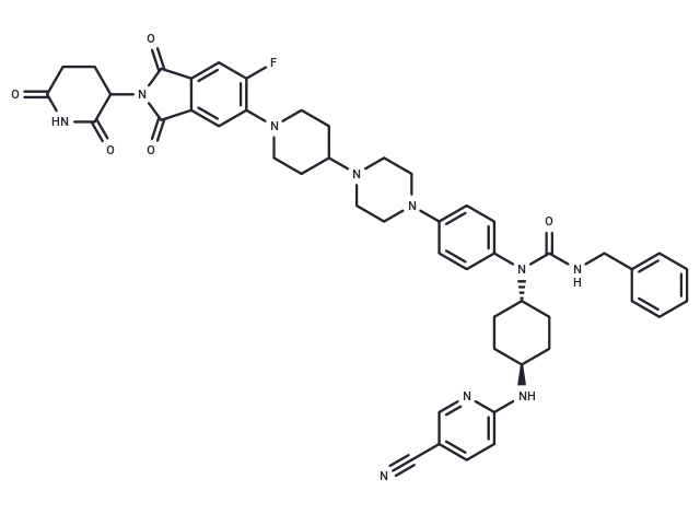 – O=C1C=2C(C(=O)N1C3C(=O)NC(=O)CC3)=CC(F)=C(C2)N4CCC(CC4)N5CCN(CC5)C6=CC=C(N(C(NCC7=CC=CC=C7)=O)[C@@H]8CC[C@@H](NC9=CC=C(C#N)C=N9)CC8)C=C6