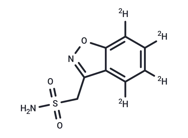 – Zonisamide-d4 is a deuterated compound of Zonisamide. Zonisamide has a CAS number of 68291-97-4. Zonisamide, a sulfonamide anticonvulsant, is approved for use as an adjunctive treatment in adults with partial-onset seizures. It may inhibit a carbonic anhydrase although this is not one of the main mechanisms of action. Zonisamide may act by blocking repetitive firing of voltage-gated sodium channels results in a reduction of T-type calcium channel currents, or by binding allosterically to GABA receptors. This latter action may lower the uptake of the inhibitory neurotransmitter GABA while increasing the uptake of the excitatory neurotransmitter glutamate.