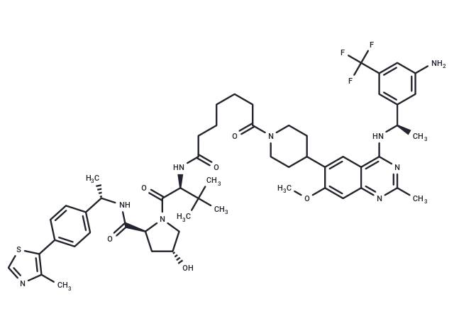 – O=C([C@H]1N(C([C@@H](NC(CCCCCC(N2CCC(C3=CC4=C(N[C@@H](C5=CC(C(F)(F)F)=CC(N)=C5)C)N=C(C)N=C4C=C3OC)CC2)=O)=O)C(C)(C)C)=O)C[C@H](O)C1)N[C@H](C6=CC=C(C7=C(C)N=CS7)C=C6)C